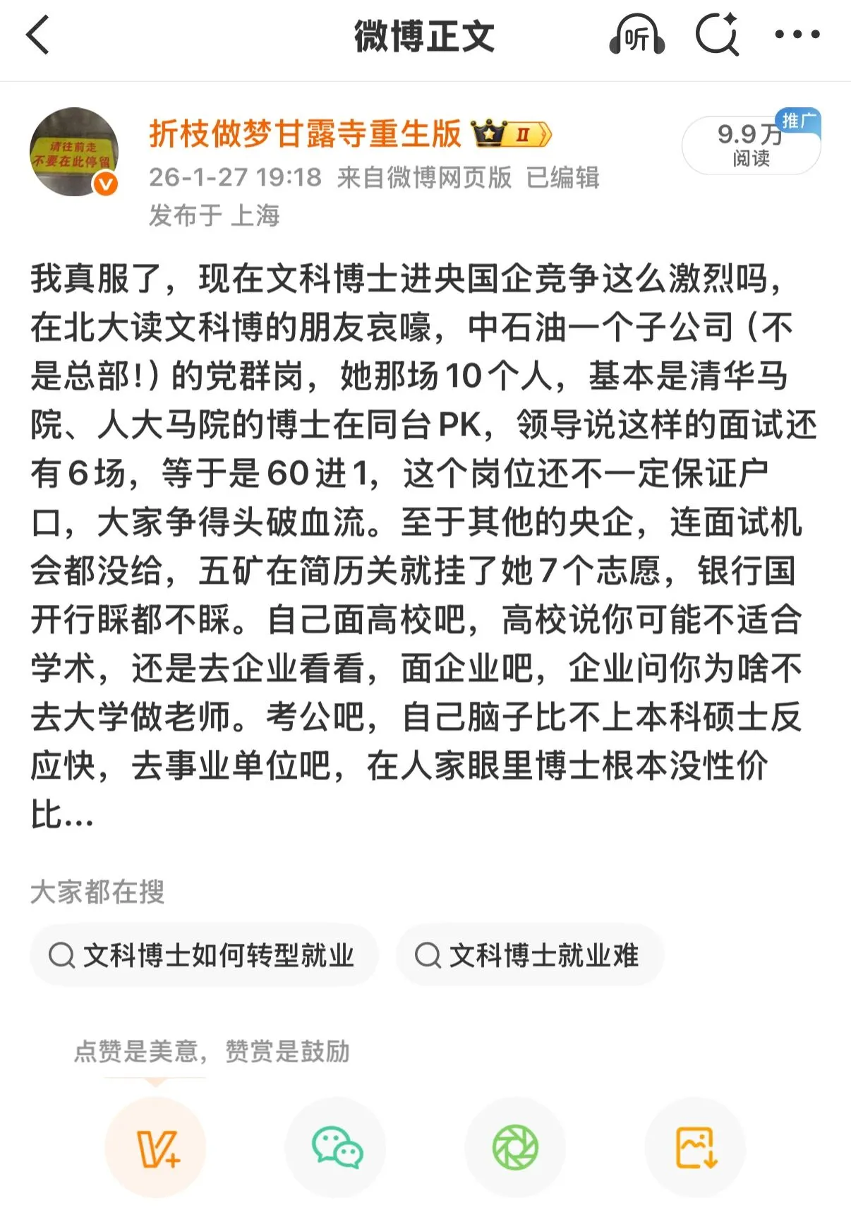 最近一条微博,吐槽北大文科博士秋招难找工作的现状:
